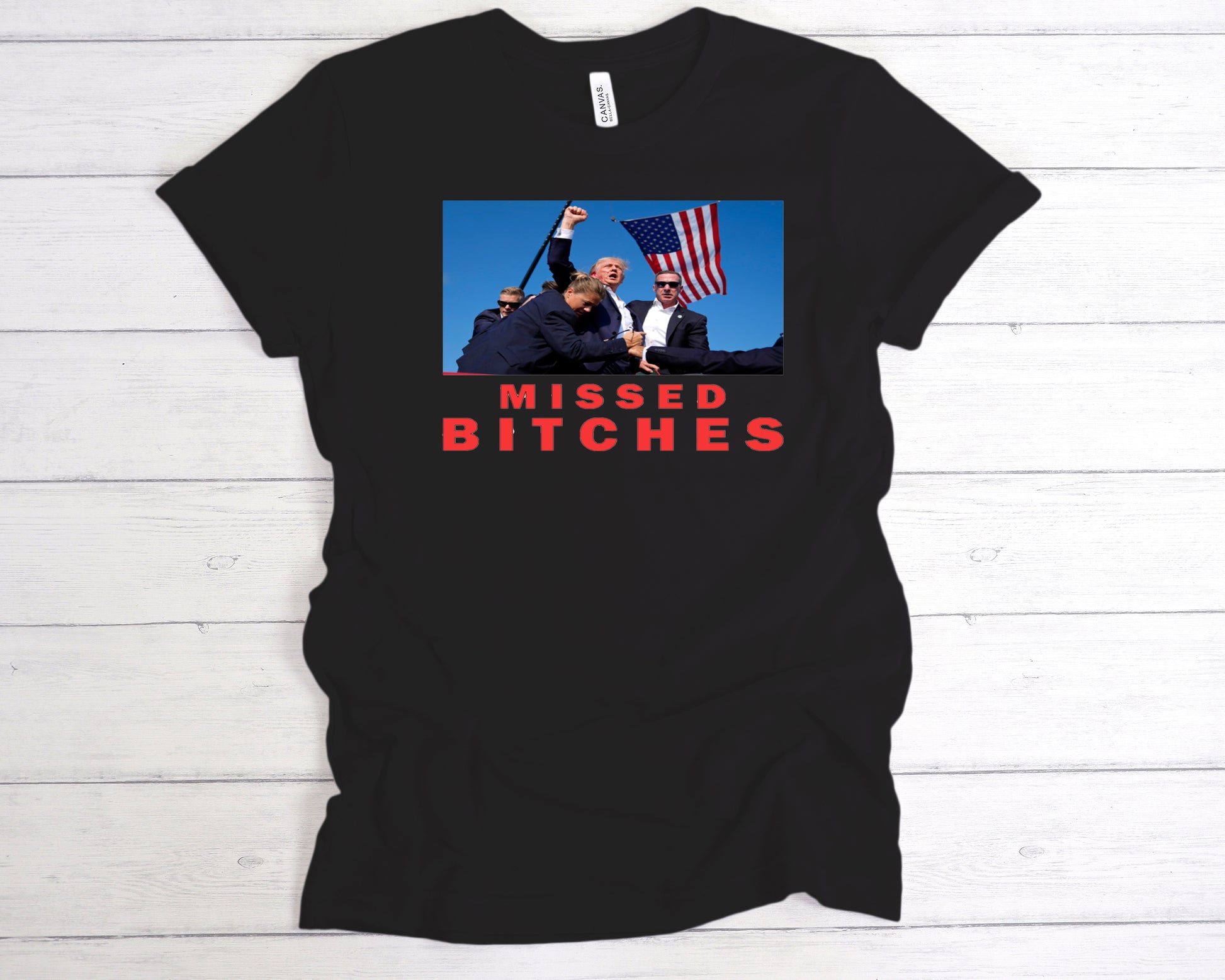 This Missed Bitches graphic t-shirt features a bold Trump design on a black unisex t-shirt. Perfect for making a statement, this t-shirt is sure to turn heads and spark conversation. Made with high-quality material, it's comfortable to wear and easy to care for. Show off your sense of humor and political views with this unique t-shirt.