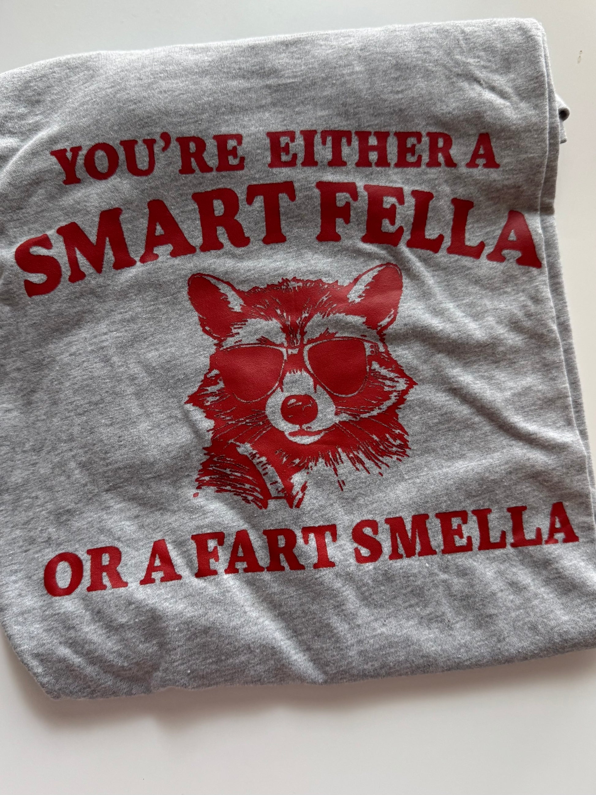 This grey T-shirt features a playful raccoon graphic paired with the bold red phrase "You are either a smart fella or a fart smella." Crafted for comfort and style, it adds a witty touch to casual wear, perfect for those who appreciate humor and uniqueness in their wardrobe.